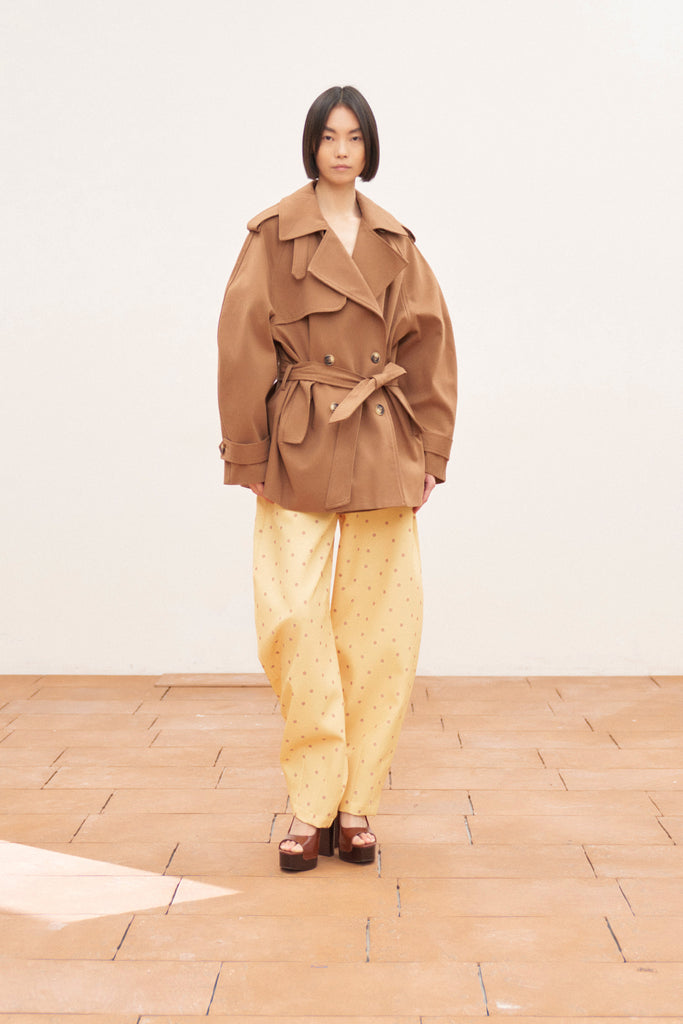Balloon-style trousers. Polka dot pattern . Front pockets and belt loops. Front zip and hook closure. Regular fit.