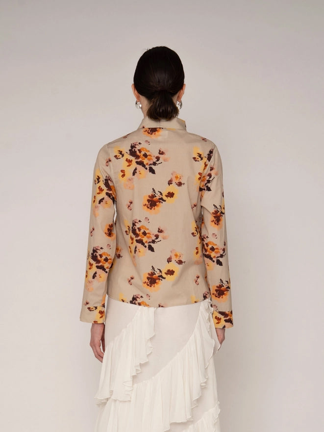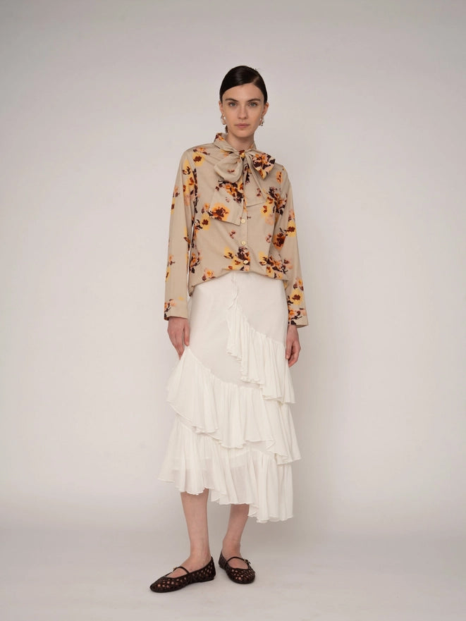 Elegant floral blouse with a bow neckline and flowing silhouette, a versatile garment that combines femininity and timeless style.
