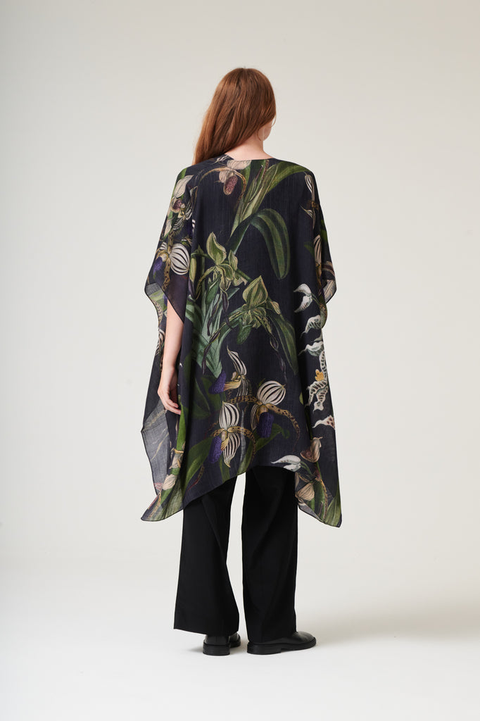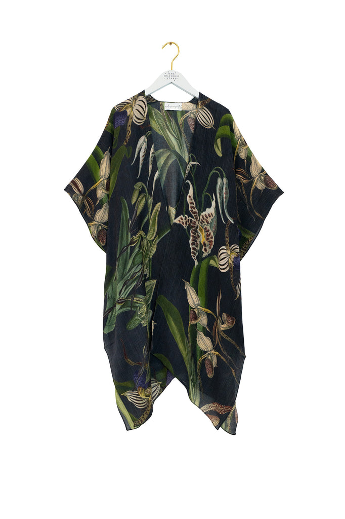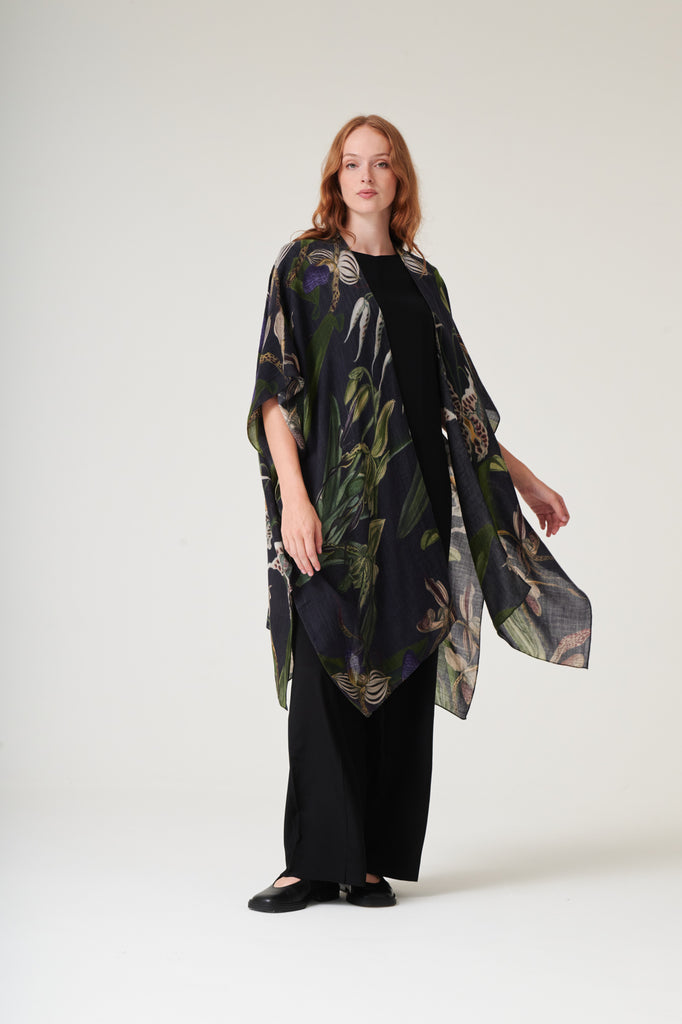 An oversized botanical print of the stunning Slipper Orchid. Set to a matt black base showing the exquisite stripe of the bloom and the contrast indigo.